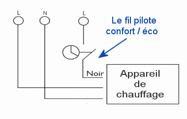 Le principe est simple : Par un fil dédié à cet usage, les programmateurs horaires et gestionnaires d'énergie "fil pilote" sont reliés aux thermostats des chaudières, aux thermostats embarqués sur les radiateurs électriques et sur les thermostats d'ambiances compatibles avec cette norme, et leur envoient sous forme de signaux électriques de faible intensité des ordres simples pour contrôler leur allure : Confort, Eco, Hors gel, Arrêt...