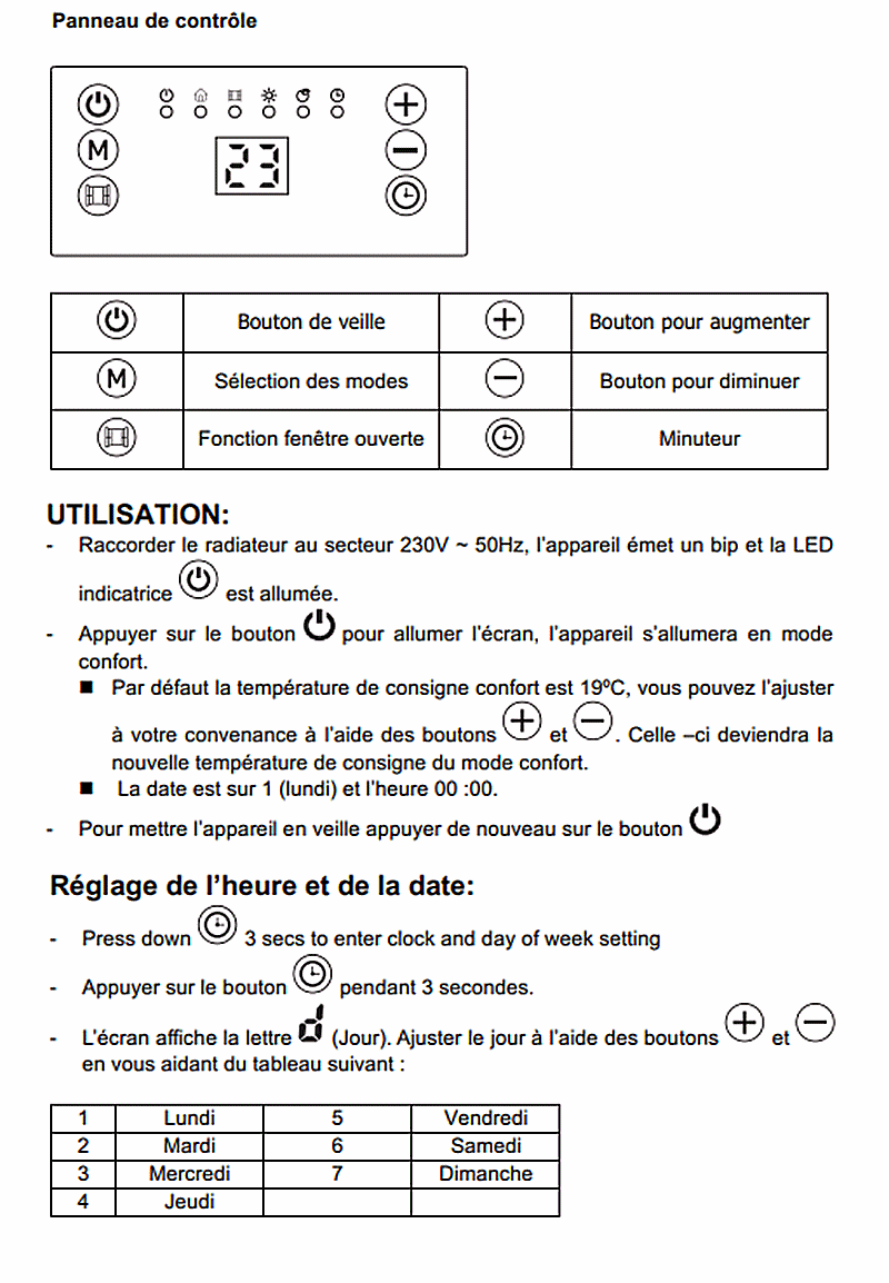 Aussi, je n'ai pas l'impression qu'on puisse régler la date et l'heure avec ce radiateur, je ne comprends pas comment tu as réussi, car j'ai exactement le même que je vois sur la photo et l'affichage est plutôt limité il n'y apparait pas d'horaire.